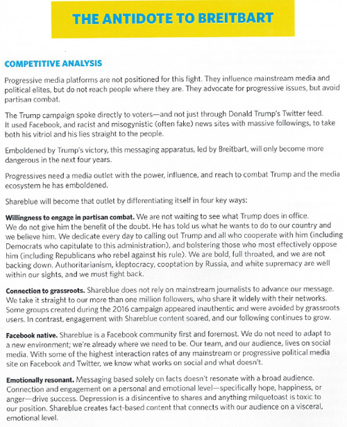 This playbook addresses Breitbart directly by including a section titled “The Antidote to Breitbart”, which describes a sub-group of Brock’s called ShareBlue. In the playbook’s own words, Shareblue is described as a “digital attacker”. In other words, an army of online trolls posting coordinated narratives against Trump on social media outlets.